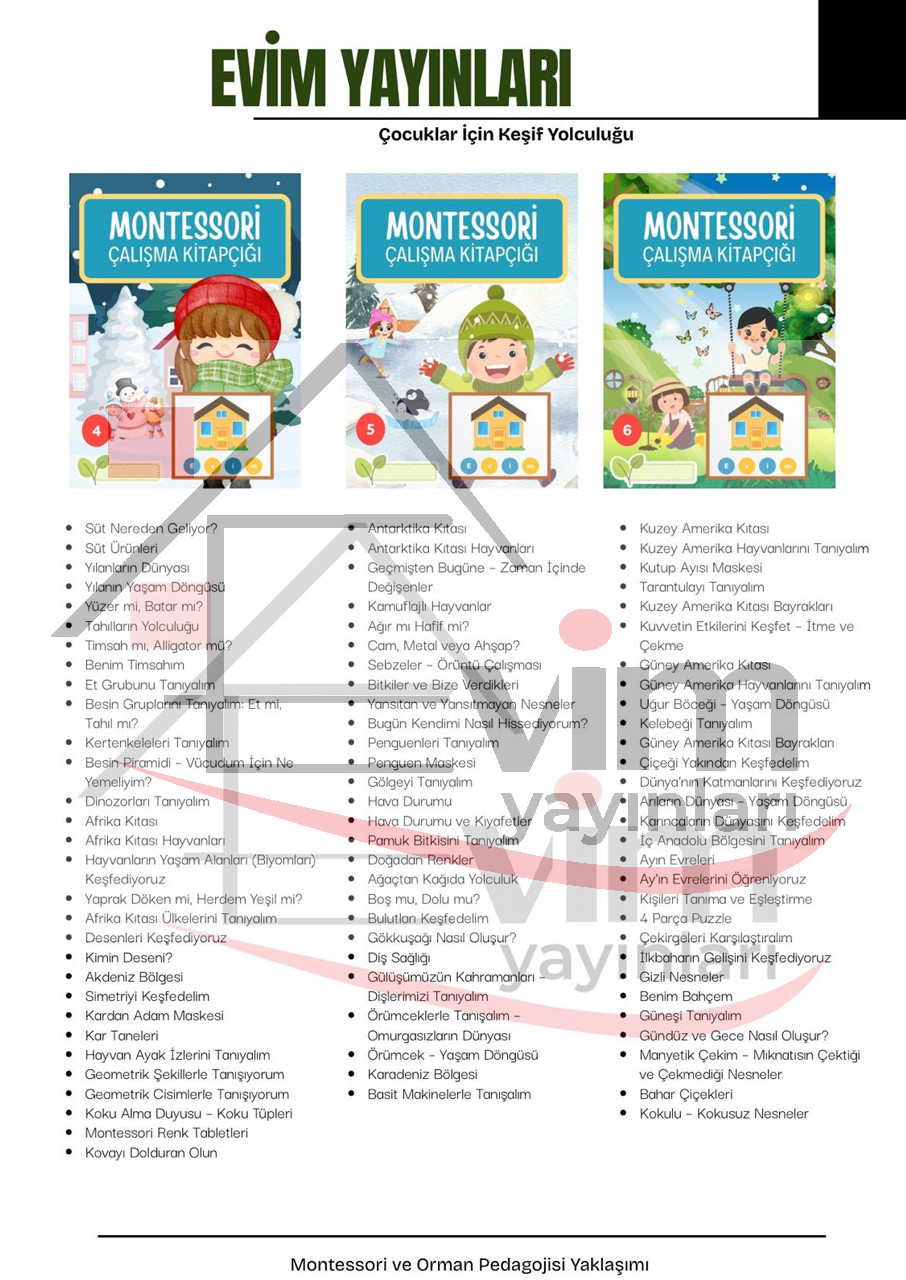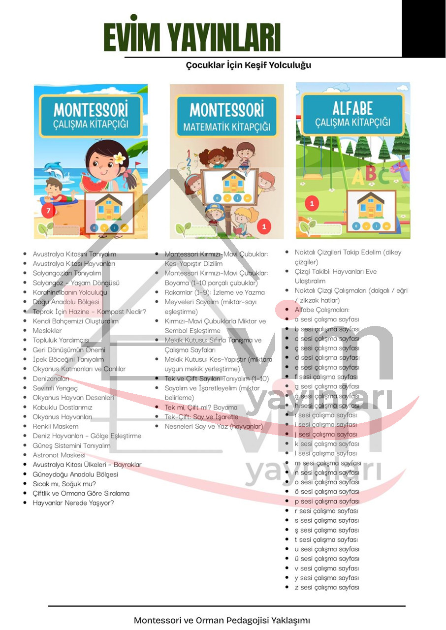 Evim Yayınları, Montessori ve Orman Pedagojisi yaklaşımlarından ilham alınarak hazırlanmış kapsamlı bir eğitim seti sunar.